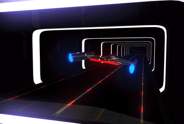 Stern landing bay access tunnel. The lights along the guideway are traveling lights which move in sequence down the tunnel.