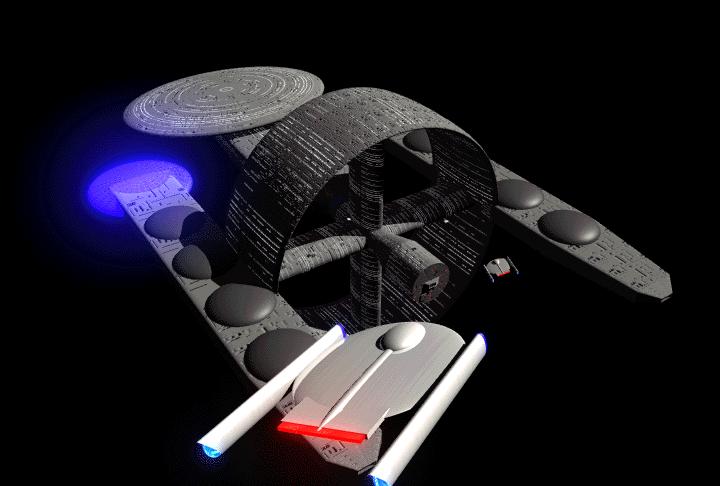 High approach to stern landing bay. There are four shuttle ships in this view and they are all the same image size demonstrating the size of the station model.